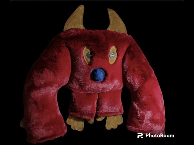 Монстрик игрушка для собак, изготовлена из искусственного меха кролика, прошит на двусторонний флис, наполнение холофайбер, рожки, глаза, нос, заглушки на руках и лапки из кожи, одна нога шуршит, вторая с пищалкой
